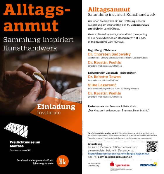 Am 11.12.2025 Eröffnet die BAK Ausstellung Alltagsanmut im Freilichtmuseum Molfsee. Silke Lazarević und ich werden am Freitag, 9.1.2026, 14-15 Uhr eine Führung geben: Was hat ein Mangelbrett des 18 Jahrhunderts mit moderner Kunst und Design zu tun? Welche Verbindung hat ein Henkeltopf von damals mit zeitgenössischer Keramik? In der Tandemführung erläutern die beiden Künstlerinnen Silke Lazarević und Susanne Juliette Koch ihr kreatives Schaffen im Rahmen der Ausstellung „Alltagsanmut. Sammlung inspiriert Kunsthandwerk“.