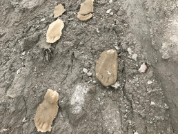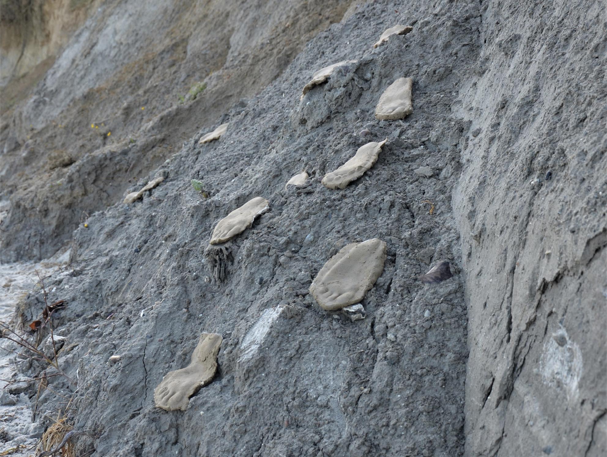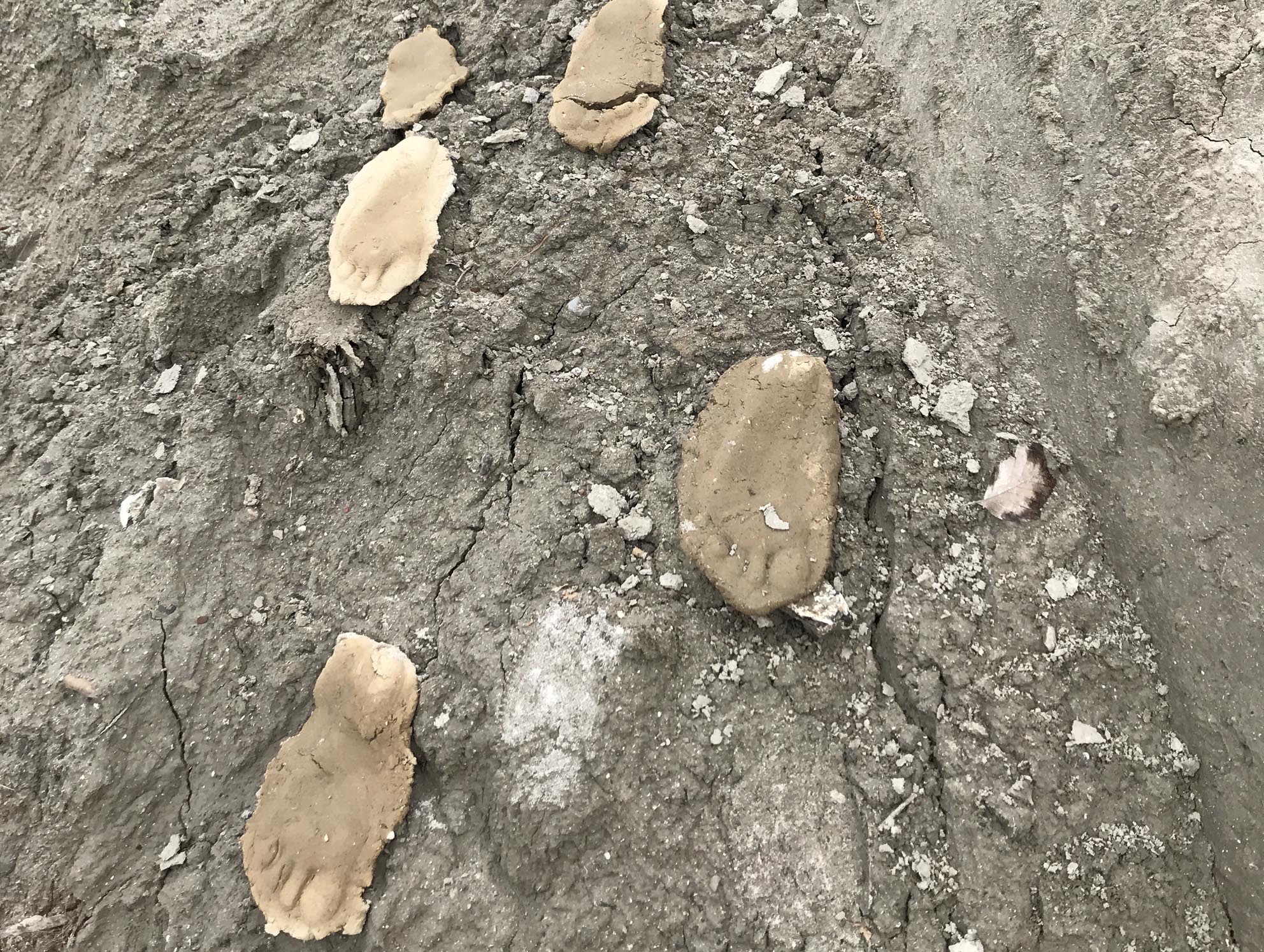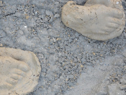 Die Fußspuren sind aus dem Lehm der Steilküste angefertigt und sind vor Ort geblieben.